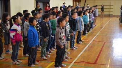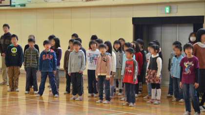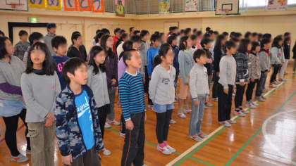 音楽朝会、曲名は「歌よ ありがとう」です。心地よいメロディーにのって、子どもたちの歌声が体育館に響きました。