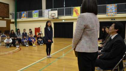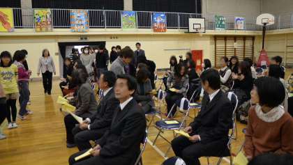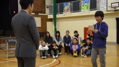 4日(月)6校時、6年生の「感謝の会」が体育館で行われました。6年児童が職員室前に職員を迎えに来てくれて、体育館に入場。ステージ前のスクリーンにこれまでの学校生活のようすがスライドで映し出される中、はじめに、職員一人一人に感謝の言葉を6年生が述べました。