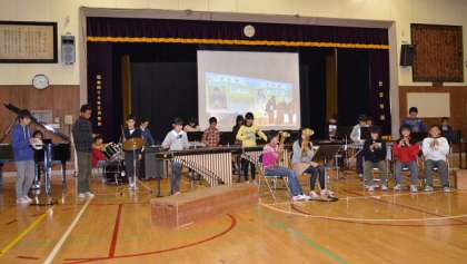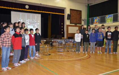 子どもたちの「感謝の言葉」は、とてもていねいで職員一人一人の心に響きました。そしてこれまで一生懸命練習してきた歌と合奏の披露です。歌は「あと一つ」、合奏は「君の瞳に恋してる」です。まっすぐに前を向いて歌う姿、そして楽器に向き合い、みんなの心を一つにして演奏する姿は、まさに最高学年を感じさせます。
