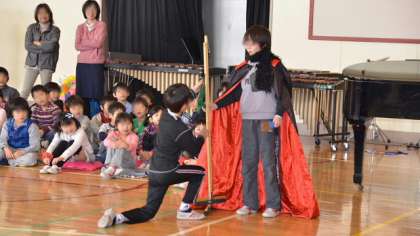 4年生の出し物は劇「夢からさめた夢 再現」です。4年生にとって学芸会で6年生が演じた劇の印象が強かったのでしょうね。見事にあの時の6年生になりきって演じていました。これには、6年生もとてもうれしそうでした。最後に劇の中の歌「愛をありがとう」を歌ってお祝いとしました。