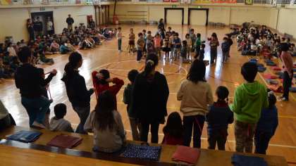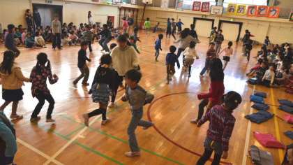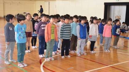 1年生の出し物は「6年生としっぽとりゲーム」です。みんなで6年生にお祝いの言葉と、たくさんお世話になったお礼の言葉を言いました。続いて、6年生対1年生の「しっぽとりゲーム」です。6年生のしっぽは長く、1年生のしっぽはとても短いので、さすがの6年生も大苦戦です。結果は1年生の勝利。さすが6年生、1年生に花をもたせてくれました。