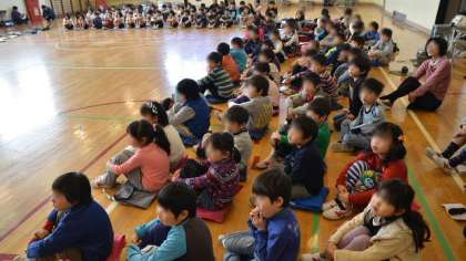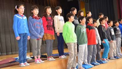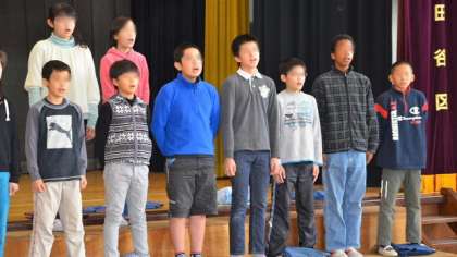 みんなからの祝福のお礼に、6年生が応えます。まず最初は歌「あと一つ」です。一生懸命歌う6年生の声に聞き入る1〜5年生です。