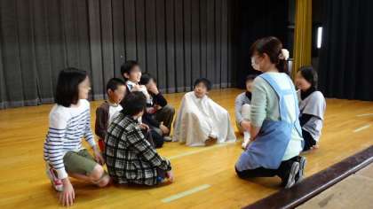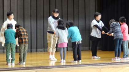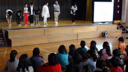 続いて、保健委員会が実施したハンカチ、ティッシュ、爪についての「さわやかチェック」の結果発表があり、優秀な学級の表彰も行いました。委員会発表の最後として、とてもりっぱな発表となりました。集会の後、みんなにねぎらいの言葉をかける養護教諭です。子供たちが、よくがんばりました。