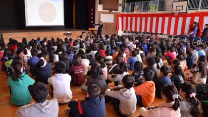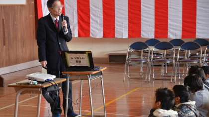11日の朝会では、東日本大震災の話の後、省エネルギーセンターの方をお招きして、省エネミニ講座をしていただきました。今年度、省エネルギーセンターによる「省エネ診断」をしていただいた関係で、その結果をもとに行ったものです。1年生にもわかりやすく省エネ診断の結果をスライドで説明していただき、どのようなことに気をつければ省エネができるか、ていねいに教えていただきました。子どもたちも真剣に聞いていました。