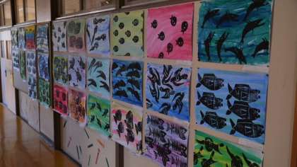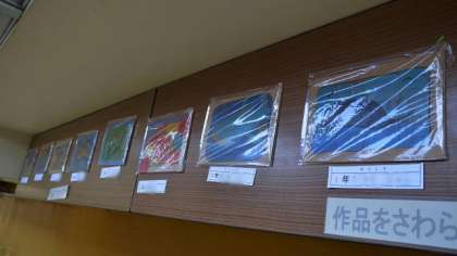 図工室前に展示してある3年生と5年生の作品です。今年度最後です。ご来校の折にご覧下さい。