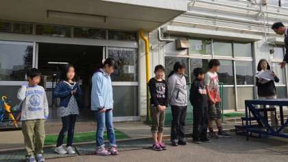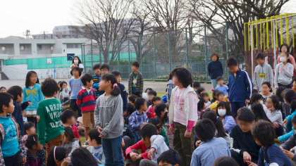 18日(月)、風が徐々に強まる中、朝会は校庭の芝生で行いました。校長講話では、残り少ない今年度の日々を大事にしようということ、正門前の桜が咲いて、それ以外にも春を感じる変化があちらこちらに現れてきていることを話しました。続いて表彰が二つです。一つ目は、図工の作品が都の展覧会、区の展覧会に出展されたこの表彰です。都は朝礼台で表彰、区は人数が多いので全員が座っている中で、名前を読み上げその場にたってもらいました。
