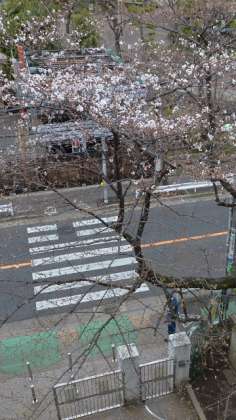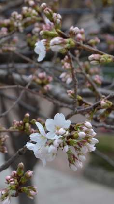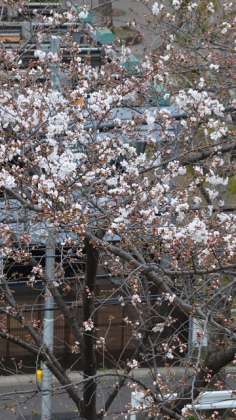 18日、強風の中桜の花が次々と開花しています。正門から見上げたところの桜が一番早く咲き始めています。学校のそばを通りかかった折に、ぜひ見上げてみてください。せっかく咲いた花がこの風で散らなければよいのですが。