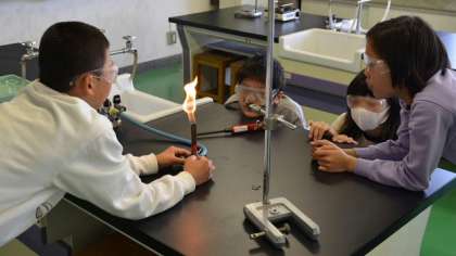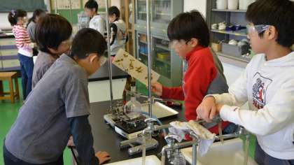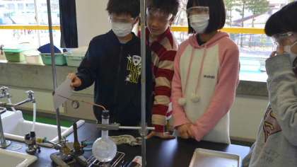 続いて、中学校でも使うガスバーナーの使い方を全員で練習した後、最後に過熱水蒸気の実験をしました。過熱水蒸気とは、調理用レンジで最近使われている、水蒸気で焦げ目がつくというあれです。丸底フラスコの中の水を過熱し、沸騰してゴム栓につないだ銅管から吹き出す水蒸気をガスバーナーで過熱すると、吹き出す水蒸気は300度以上になります。すると紙の発火点を上回っているので、紙が焦げるというものです。安全に配慮し、安全めがねを着用して行いました。小学校の枠を超えた内容の実験でしたが、子どもたちは真剣に取り組み、トラブルもなく実験できました。実験の楽しさ、おもしろさを感じてくれたかなと思っています。