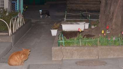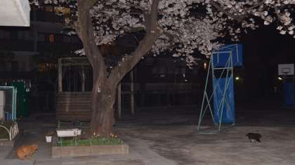 22日、夜まで残って仕事をしていたら、校長室の前で猫の声。ようすを見たら、猫が2匹。春の陽気に誘われて、桜の樹の下で猫もお花見ですか?