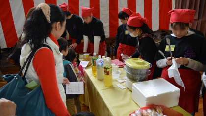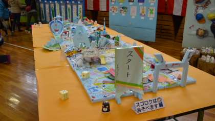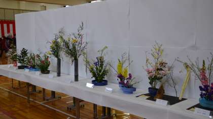 第1部が終了して、ステージ発表は休憩です。体育館1階ではボランティアクラブによる「きっさひまわり」が軽食と飲み物を提供してくれました。「ものづくりくらぶ」の作品と、「伝統くらぶいけ花」も飾られていました。どれも見事な作品です。