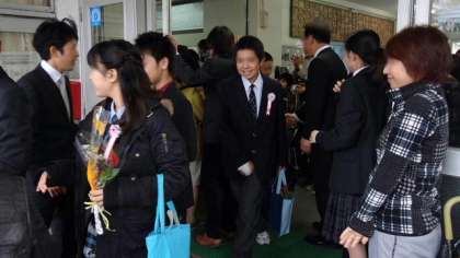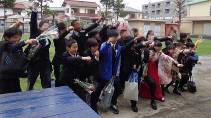 学級で担任の話が終わり、いよいよ見送りの時がやってきました。あいにくの雨で、予定していた校庭から、1階廊下での見送りとなりましたが、晴れやかな笑顔で保護者、家族の皆さん、そして在校生、職員に見送られ、まさに春爛漫の今日の佳き日、21人の子どもたちが希望丘小学校を巣立ちました。お忙しいところ参列いただいた地域の皆様にも改めて感謝申し上げます。
