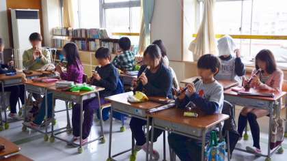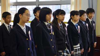25日卒業式の舞台裏のようすを紹介します。朝、登校してきた子どもたちは、本番を控えて最後の練習をしました。上の写真は、音楽室で発声練習中の卒業生です。実は一人の女子が親戚のご不幸があり欠席となったのですが、それを伝えられた子どもたちは動揺しました。担任が「その子のためにもがんばろう」と呼びかけ、気をとりなおして練習している子どもたちの健気な姿です。下の写真は、教室で入退場曲の演奏練習をする5年生です。卒業生から学校を託される5年生の緊張感も高まっていました。