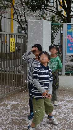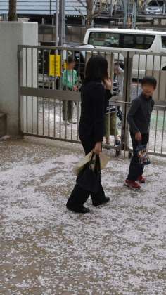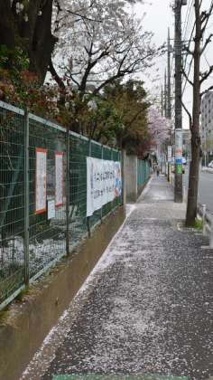学校北側の桜が散り始め、道路はまるで雪が降り積もったようになっています。