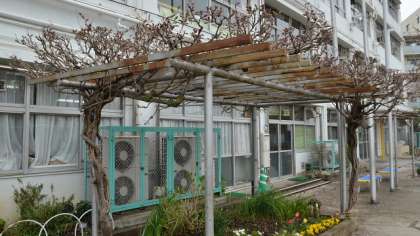 平成24年度最終日の3月31日となりました。暖かい天気が一転して肌寒く感じる日が続いています。この気温のせいで、桜の花が長持ちしているようですが、日に日に散っていく桜の花に名残惜しさを感じます。職員室前のフジの花芽がもうふくらんできました。入学式の時にはもう咲くかもしれません。