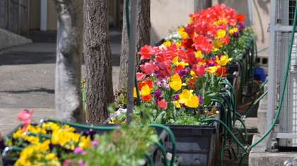 4日、昨日までの雨と肌寒さが一転して、今日はぽかぽか陽気になりました。晴れ渡った空の下、花々が一斉に開いて華やかな雰囲気になっています。教員は遠足の下見にでかけました。