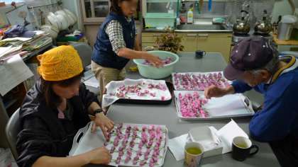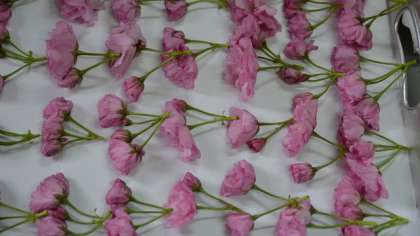 来年の「桜湯」に使う、桜の花の塩漬けの仕込みを学校主事が行いました。より色鮮やかな給食室前の八重桜の花を使います。今年は花が咲くのが早くて、入学式前に次の年の分の仕込みにはいりました。・・・ということは・・・本校の卒業式や入学式の桜湯は、本校の学校主事が手作りしているものなのです。