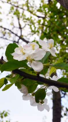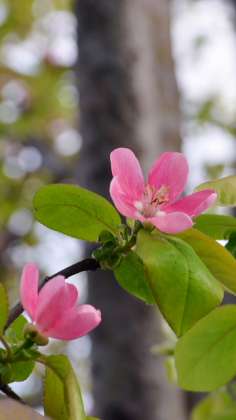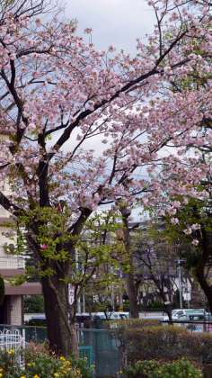 4日、校庭の木々の花のようすです。 左:東門の八重桜は八分咲きです。 中:姫リンゴの花がもう咲き始めました。 右:カリンの花も濃いピンク色の花を咲かせています。そのほかにも、どんどん花芽がふくらんで・・・春が一気に押し寄せてくるような勢いを感じます。