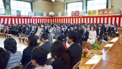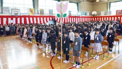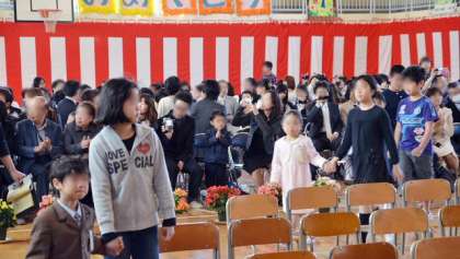 10時、いよいよ入学式の開始です。6年生と手をつないで新入生の入場です。今年度の新入生は61名2クラスです。たくさんの来賓の方々、保護者、家族の皆さんが参列してくださいました。入場が終わり、ちょっと緊張気味の新入生ですが、しっかりとした姿勢と態度で式がスタートしました。