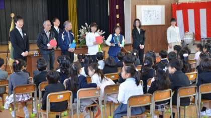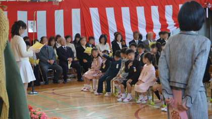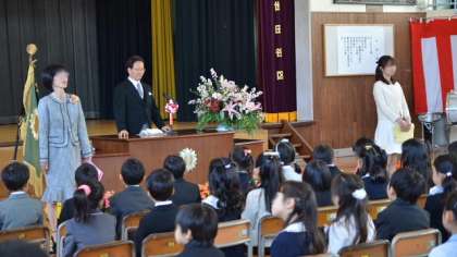 式辞の後、担任の紹介をして、子どもたちの前に立った担任が、新入生の名前を一人一人呼びました。呼ばれた子どもたちはしっかり手を挙げて、元気な返事をしました。続いて、新入生が関わる職員を紹介しました。