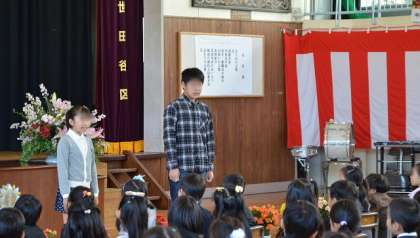 続いて来賓を代表してPTA会長さんから祝辞をいただき、来賓の紹介、6年児童歓迎の言葉とプログラムは続きます。新入生にとって挨拶や紹介が多く、大丈夫かなと思って見ていましたが、よく頑張り、しっかり聞いている子が多かったので安心しました。6年生代表もとてもしっかりした口調で、堂々と新入生に語りかけることができていて立派でした。
