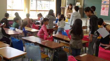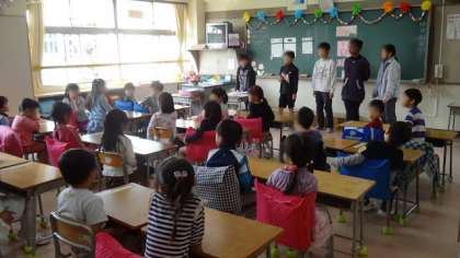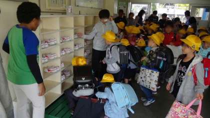 9日、登校してきた1年生のお世話係を、6年生がしました。みんなより早く朝8時に登校してきた当番の6年生が、昇降口でまだ学校生活に慣れていない1年生を迎え、教室では道具のしまい方などお世話をしました。すっかりお兄さんお姉さんの雰囲気です。