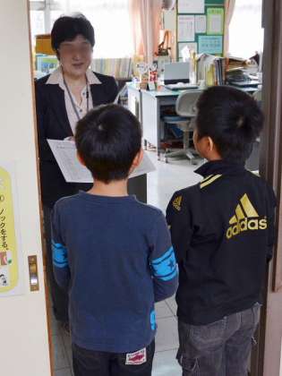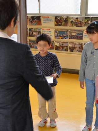 本校では、朝、各クラスで出欠確認や子どもたちの健康状態をチェックしています。その結果を記入したカードを、その日の当番の子が職員室まで報告しに来るのですが、報告の仕方のきまりがあります。職員室の戸をノックしてから開け、学年、組、自分の名前を述べ、報告しに来たことを述べます。対応する(通常は副校長)教員の、出欠や健康状態についての質問に答えます。最後は「失礼しました」の言葉で教室に戻るのですが、その際、教員も「ありがとう」とか「ご苦労様」ということにしていて、それに対して子どもたちも「どういたしまして」と応えることにしています。日常的な会話で、少しでもマナーや礼儀を身につけさせようという意図があります。