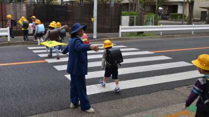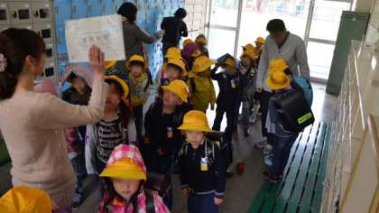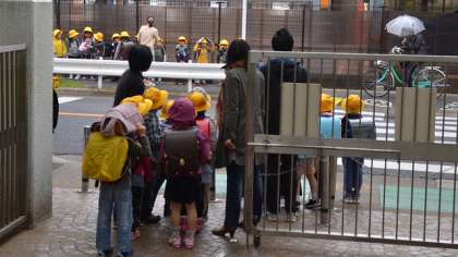 集団下校の12時頃、霧雨がふり始めました。急遽芝生の上に集合していた子どもたちを玄関に入れ、グループの子がそろうのを待ちます。ほとんどの子が傘を持っていませんでしたが、朝方寒かったせいか上着を着ている子が多く、さらに黄色い帽子で雨が防げると判断。職員が付き添い、送り届けました。