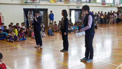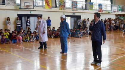 次は「〇〇先生はだれだクイズ」です。3人の先生が出てきてその中の本物を1年生が当てます。それぞれ変装したり、言葉でごまかしたり・・・さあ、にせ者はだれでしょう?