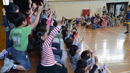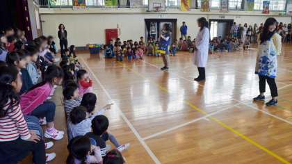 「〇〇先生はだれだクイズ」、1年生より、2年生から6年生のほうが盛り上がっていたかもしれませんね。1年生も、にせ者の言葉にだまされず、ちゃんと本物を見やぶっていましたよ。