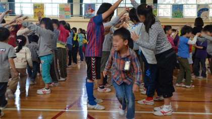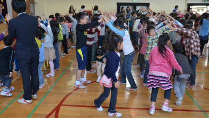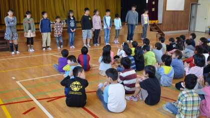 予定より時間がオーバーしましたが、大いに盛り上がって会は終了。2年生から6年生の間を通って1年生が退場します。これで1年生も「希望っ子」の仲間入りですね。最後はこの会を企画運営した4、5、6年生の昨年度後期の代表委員に、みんなで拍手を送りました。