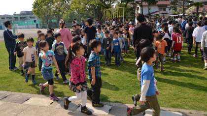 看護当番から今週の目標について話した後、話しの最初と最後の礼の仕方、退場の仕方を指導しました。音楽に合わせて教室に戻る子どもたちは、姿勢よく歩くことができました。朝会の基本的なルールをしっかり身につけた今日の朝会でした。合格です。