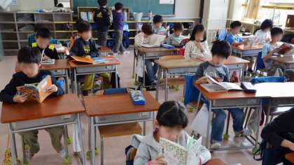 16日朝、2、3年生の読書タイムのようすです。今年度から希望丘小学校では、従来水曜日だけだった朝の読書タイムを、火・木曜日にも実施することになりました。子どもたちがより本に親しむ時間を多く確保しようという目的です。今日も各教室で静かに読書をする姿が見られました。