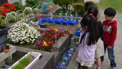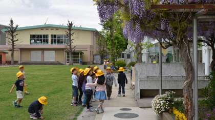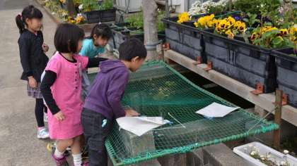 19日(金)、1年生が「春をさがそう」の学習で、校庭を散策していました。花壇の花や池のメダカを見つけて興味津々です。教室にもどって思い思い絵を描きました。