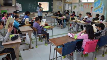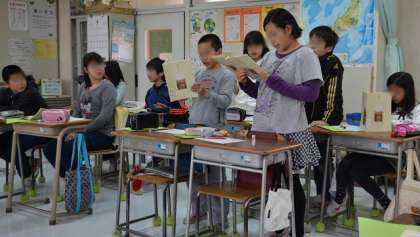 19日、6年2組の教科「日本語」の授業の様子です。日本語の響きやリズムを感じる学習で、三好達治さんの詩「山なみとほに」を読みました。子どもたちは早春の自然のようすを想像しながら何度も読むうち、しっかり暗唱できるようになっていました。