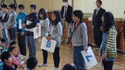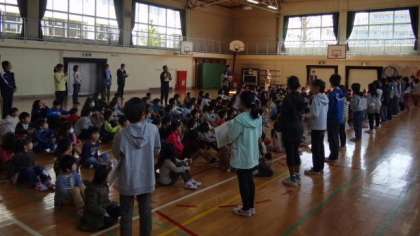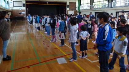 22日(月)朝、異学年交流を目的として、1年から6年までが縦割りで編成する「希望っ子班」の結成集会を行いました。体育館に集まり、希望っ子班ごとに並んだ子どもたちの前で、やる気満々の6年生の班長さんたちが自己紹介しました。