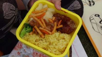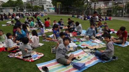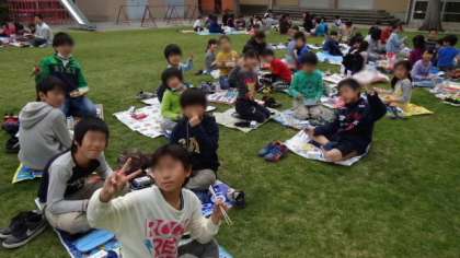 23日、希望っ子班ロング集会の後は、今日の給食は校庭の芝生で、希望っ子班ごとに食べるお弁当給食です。お弁当は、給食を各自の弁当箱につめます。今日のメニューは、バターライス、ハンバーグ 粉ふきいも、ブロッコリー 牛乳です。
