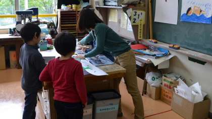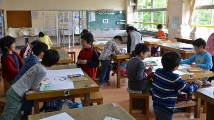 25日、まだインフルエンザによるお休みの多い2年生。図工の時間も本格的な作品制作は持ち越しにして、自由な発想で絵を描いていました。思い思い楽しそうに描く子どもたちです。