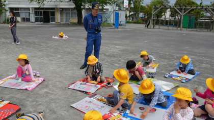 今日はあいにく風が強く、風にあおられて、絵を描く用紙が飛びそうになってしまったり、途中ちょっと雨がぱらついたりしました。消防士さんも子どもたちに気さくに話しかけ、励ましてくださいました。できあがった子どもたちの絵が楽しみですね。