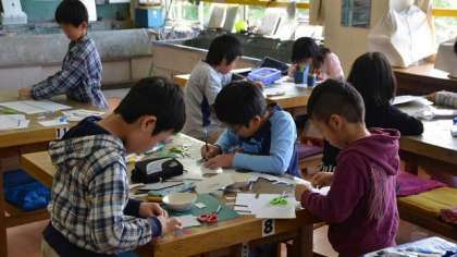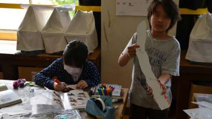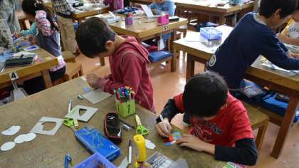 厚紙で形を作り、それをピースごとにハトメピンでつないで、動きを楽しむ作品です。それぞれ色や形を工夫して作っていました。中には素材ボックスから材料を探してきて活用している子もいました。