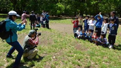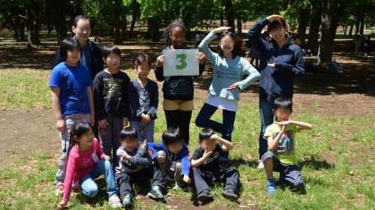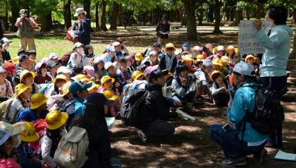 蘆花公園に到着。昨年までは砧公園まで歩いて行っていましたから、それに比べれば近いですね。公園に着いた子どもたち、まず希望っ子班ごとに記念撮影をしました。班は全部で18班あります。今年度から1年生が例年の2倍いますから、班のメンバーの4分の1以上が1年生となりました。今年度1年間、一緒に遊んだり給食を食べたりする大事な仲間です。