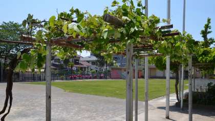 ゴールデンウィーク最終日の6日、今日は5日子どもの日の振り替え休日で学校はお休みですが、今日も天気がよく気温もぐんぐん上がっています。校庭の植物もどんどん成長しています。校長室前のブドウ棚でも、葉が茂ってその根本に小さなブドウが・・・。夏には紫色の果実になるブドウ、どのように育っていくか楽しみですね。