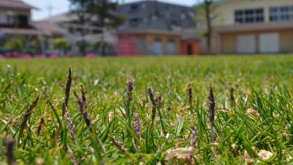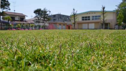 校庭の芝生は青々とした冬芝の間から、冬の間黄色く枯れていた幅広の葉の「野芝」が伸び始めているところです。目をこらしてよく見ると・・・穂が出ていて稲と同じような花が咲いています。小さな小さな世界に改めて目を向けると、新しい発見がありますね。そろそろ芝刈りが必要な季節になってきました。