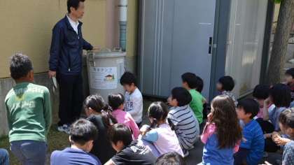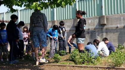 1学期の理科では、各学年に植物の栽培活動が設定されています。3年生はホウセンカの種をプランターにまきました。昇降口に近いプランターで栽培して、成長のようすを観察しやすいようにします。水やりは体育館に設置されている雨水タンクの水を使うようにするので、担任が使い方について説明しました。6年生はプール南側の学級園にジャガイモを植えています。今日は芽かきと雑草取りをしました。