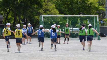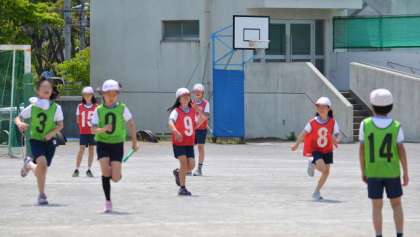 9日、5年生の体育のようすです。校庭でリレーのバトンタッチの練習をしました。後方から来るランナーに合わせてスタートダッシュし、いかに素早くバトンをわたすかが課題です。よく考え、互いに声を掛け合いながら練習していました。