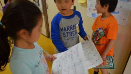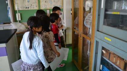 3、4人ずつのグループに分かれて、校内を探検し、2年生が一生懸命説明します。1年生もちゃんと聞いているようすがかわいいですね。理科室を訪れた子どもたち、骨格標本や人体標本の前で「ドキドキ」していました。今日の2年生は、どの子も、りっぱなお兄さんお姉さんぶりを発揮していました。