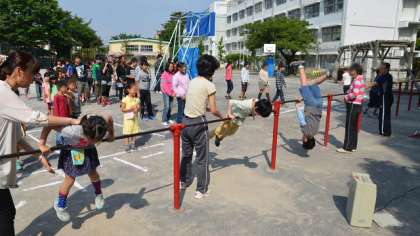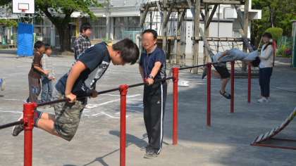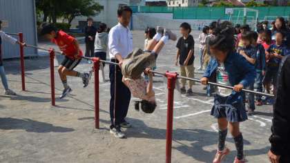 学級のみんなが1列に並んで、低学年は「前回りおり」、高学年は「逆上がり」に挑戦です。鉄棒が苦手な子は、担任が補助をしました。短い時間でしたが、何度も回ることができたクラスもありました。