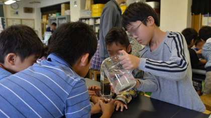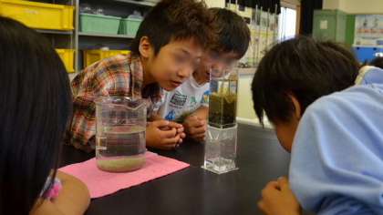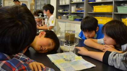 濁りが沈殿した水に最後の仕上げは濾過です。濾過剤の砂や小石を通り抜けた水は、直ぐに飲めそうなほど透明できれいになりました。食い入るように見つめる子どもたちのまなざしが印象的でした。