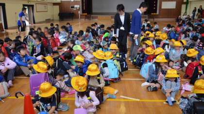 方面別に分かれて並んだ子どもたちを、事前に調べて作成してある名簿と照合して確認します。全員の確認がとれたところで集団下校です。体育館の2ヶ所の出入り口から下校させました。