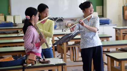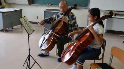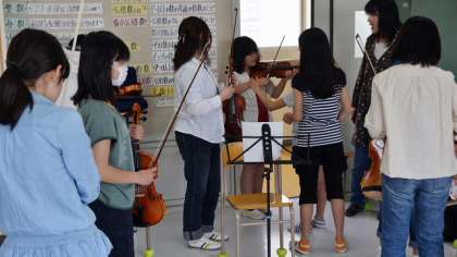 18日(土)午前は、「子どもぶんか村」の音楽クラブジュニアオーケストラの練習もありました。現在、子どもぶんか村の参加者募集期間ということもあり、新入部員や見学の方もたくさん参加していました。前半はパートごとの練習を、校内の特別教室で、講師の先生に教えていただき行っていました。