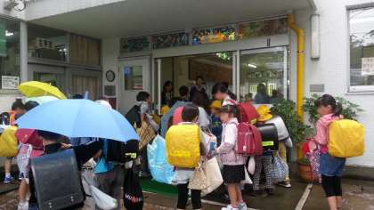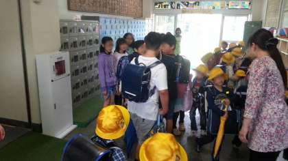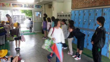 20日(月)、朝から降り続く霧雨の中を子どもたちが登校してきました。雨の日は時間までの玄関前待機がありません。8時5分の開門と同時に、登校してきた子どもたちは玄関前で傘についた雨のしずくをはらって、次々と昇降口に向かいます。今日のあいさつ当番は5年生。いつもと違って玄関の中で元気に「おはようございます」のあいさつをしました。